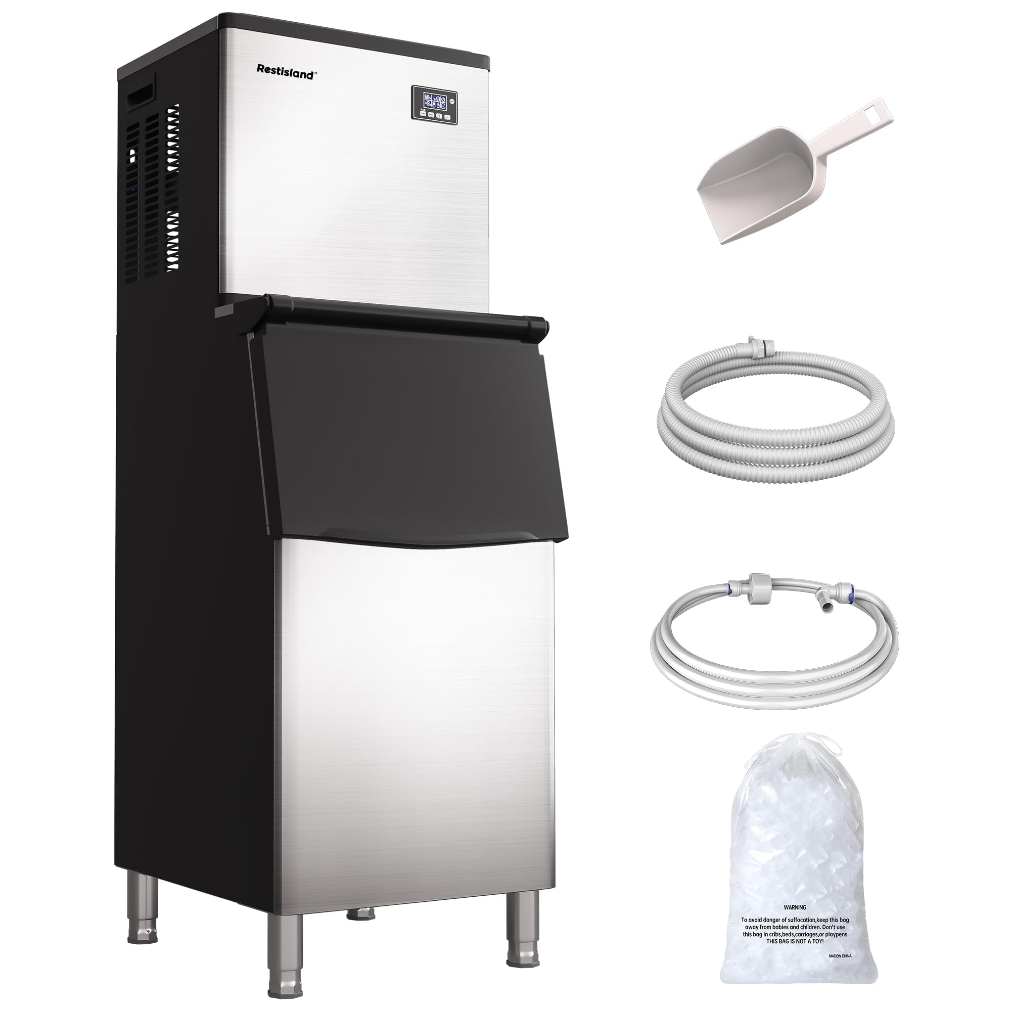 Can produce 360 lbs of crystal clear ice cubes every 24 hours, with each cube measuring 0.9"x0.9"x0.8". It also has a storage capacity of 200 lbs.